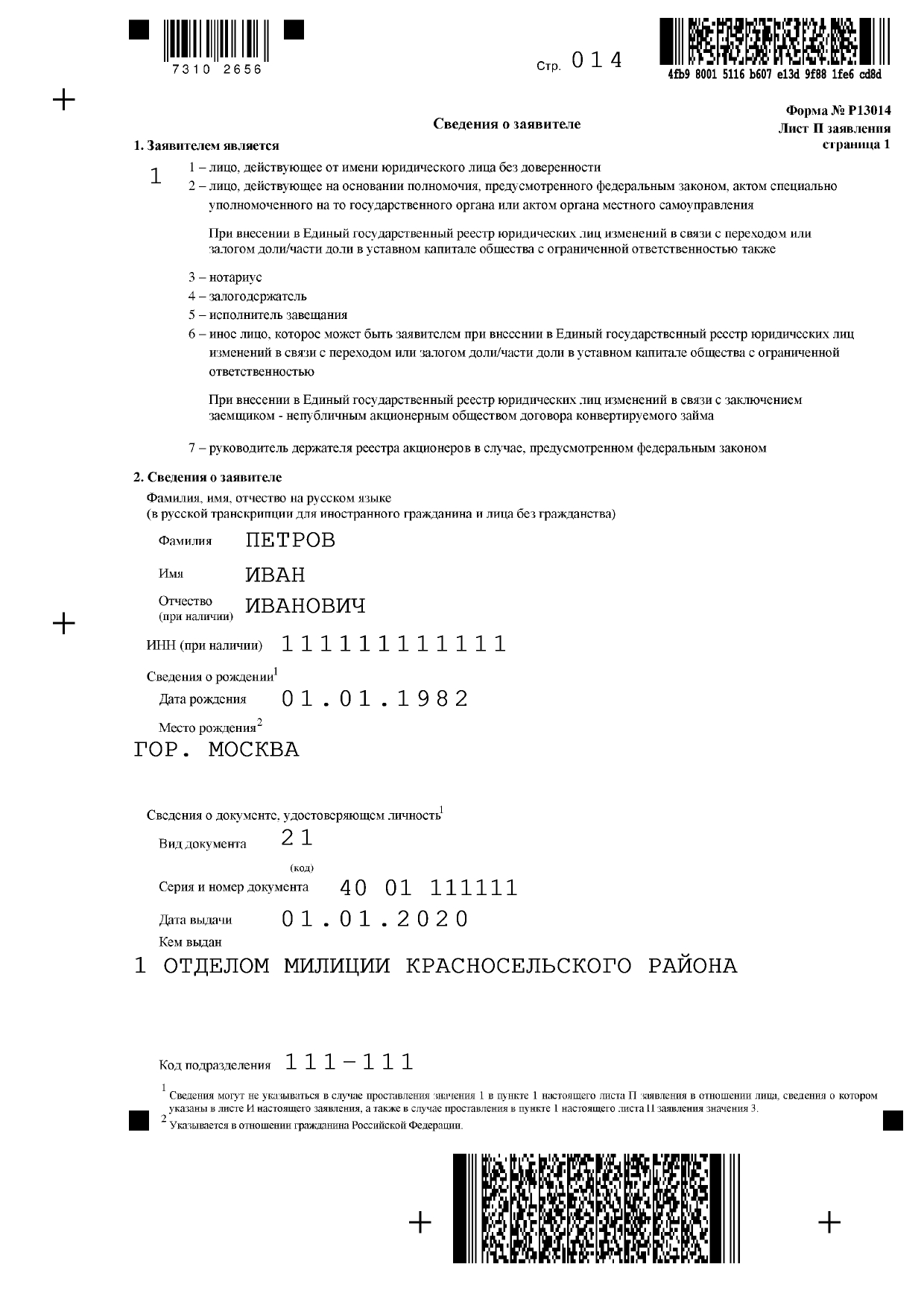 Обратите внимание! С 18.12.2021 изменилась форма заявления Р13014. Заявление можно подать только на новом бланке (на первом листе новой формы штрих-код с номером 7310 2014). Все образцы и примеры заполнения соответствуют новой форме. Скачать новый редактируемый бланк Р13014.